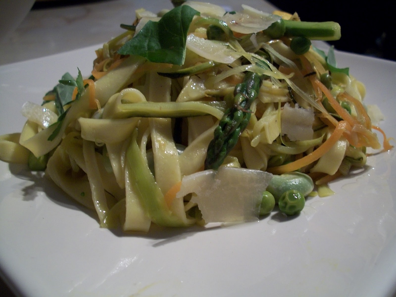 By now the pasta should be cooked so lift pasta from water with tongs and add the the vegetables, toss the pasta together with the vegetables so pasta becomes coated in the cooking liquid.